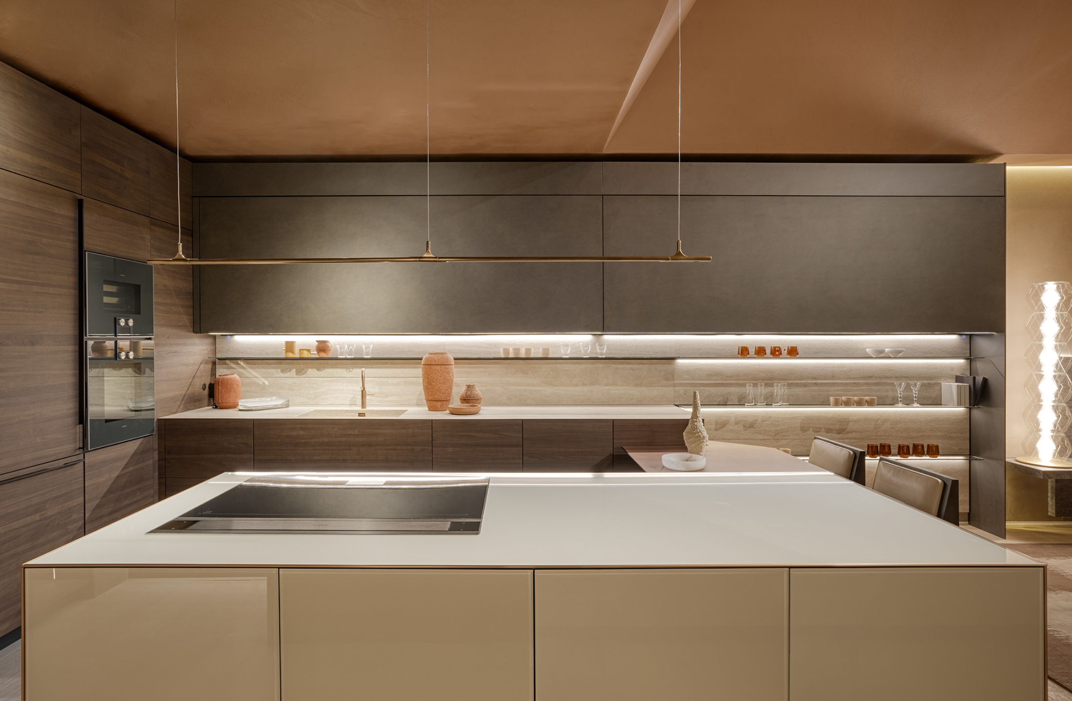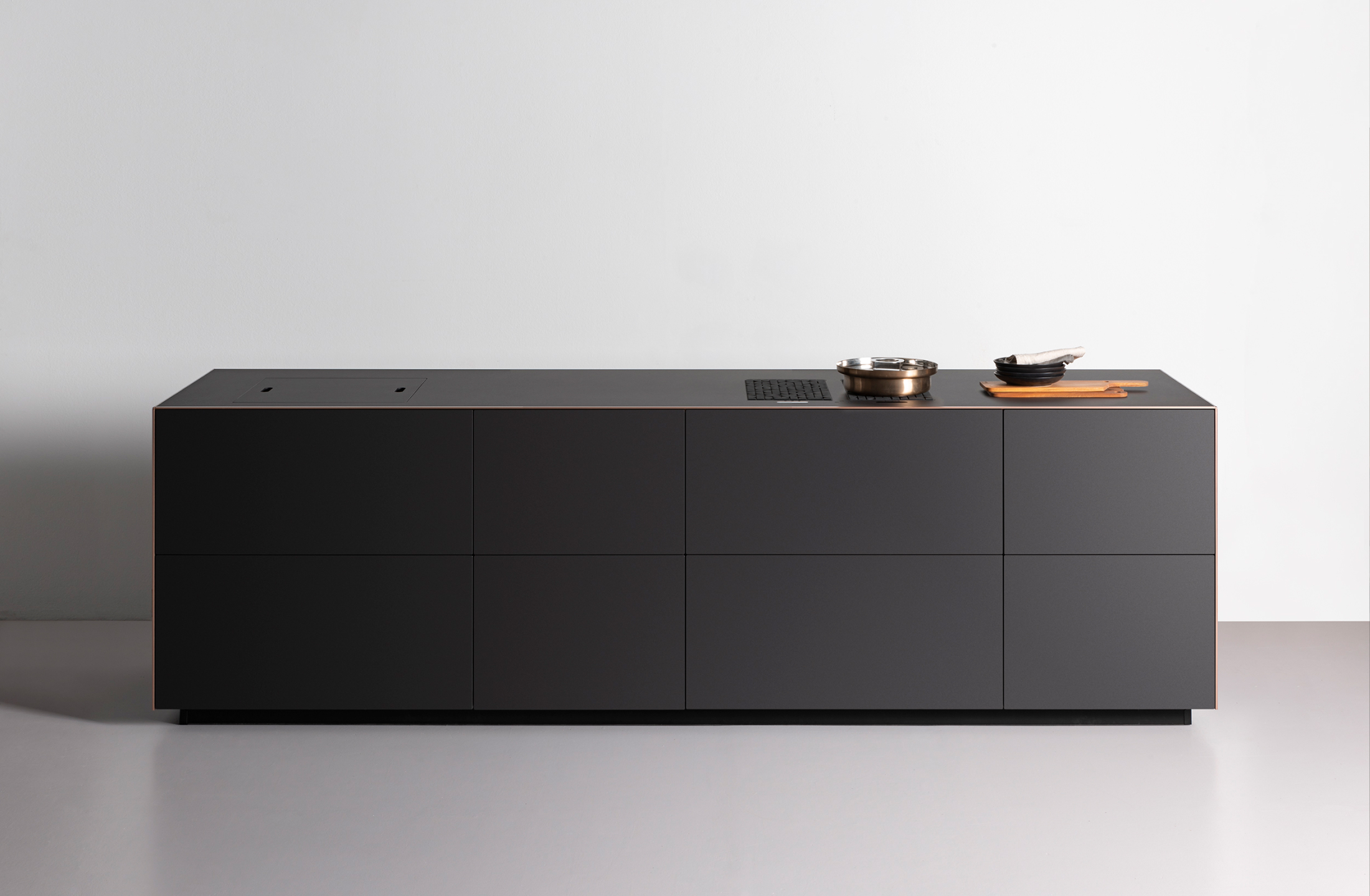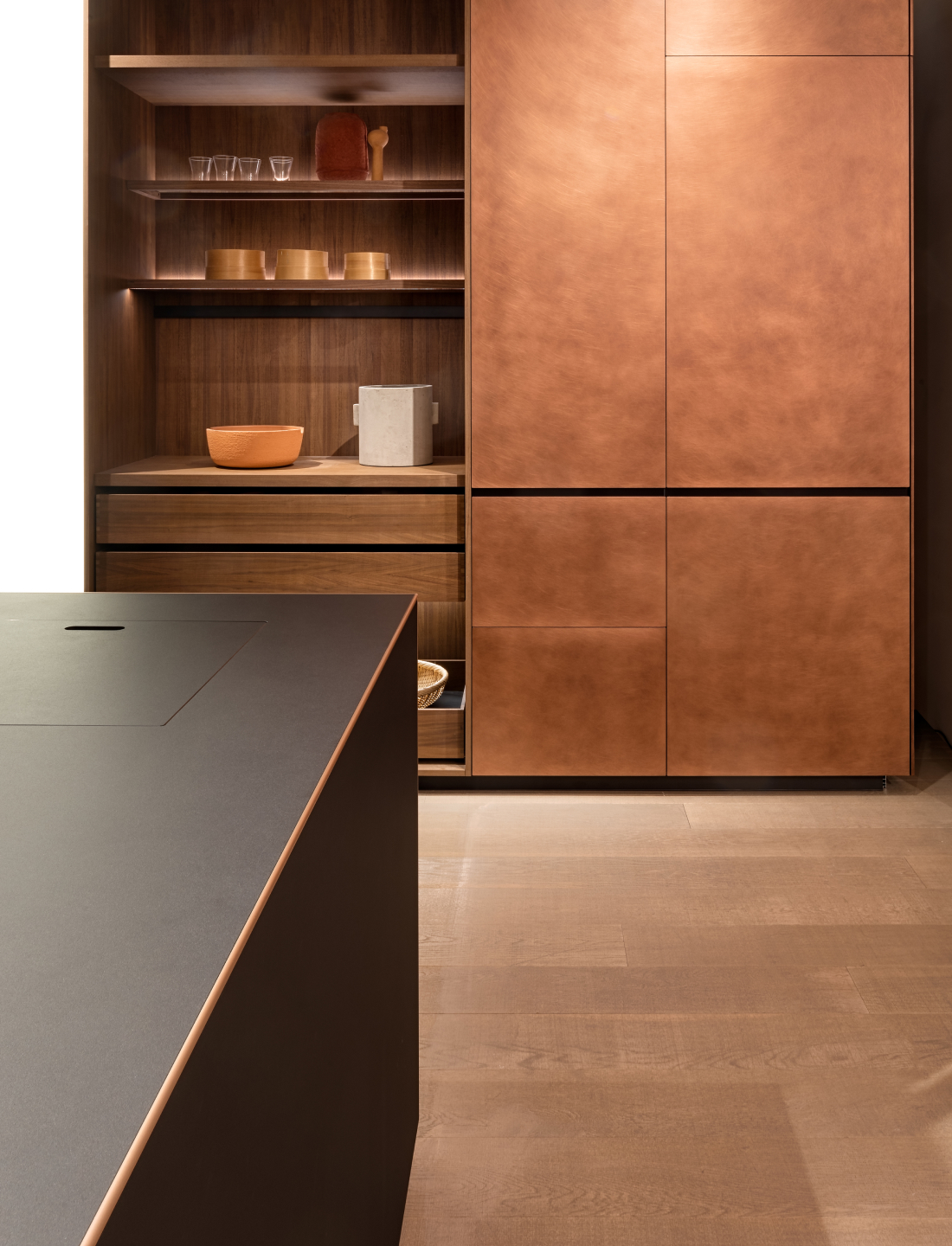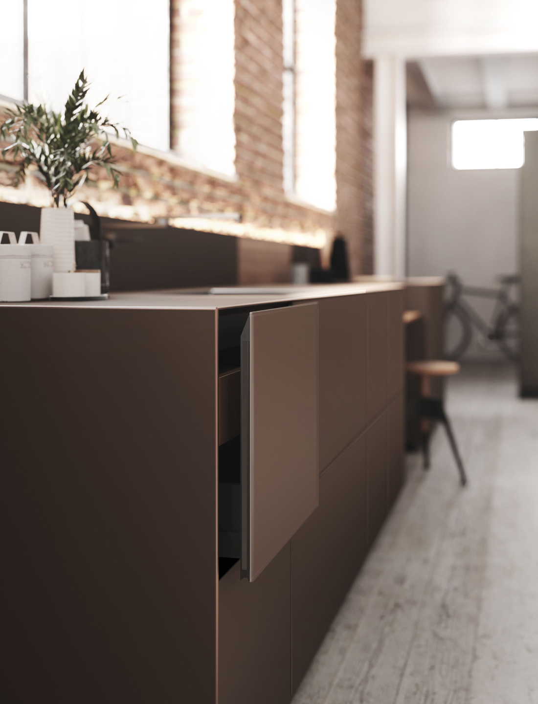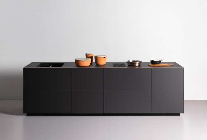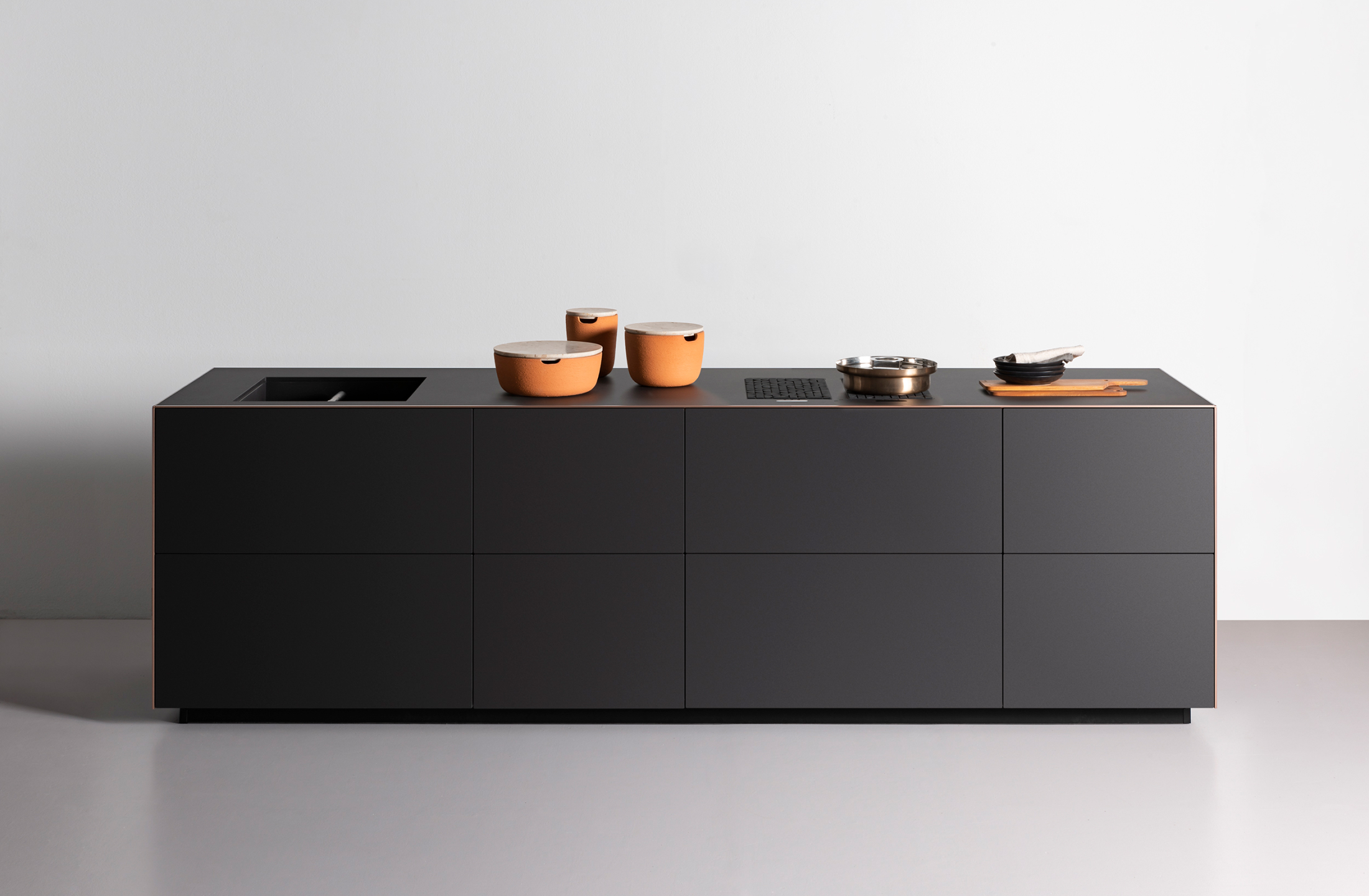 純粋なボリュームを追求し生まれたArtematica Soft Outlineは、トップ、扉、サイドパネルが一体となり、まるで一つの塊のような調和の取れたデザインを実現しています。上品に装飾された金属のプロファイルが、キッチンのエッジを走るように、ボリュームを際立たせています。さらに、シームレスな表面を強調し、洗練されたエレガンスを加えます。アルマイト加工を施したアルミプロファイルは、黒、銅、ブロンズからお選びいただけます。