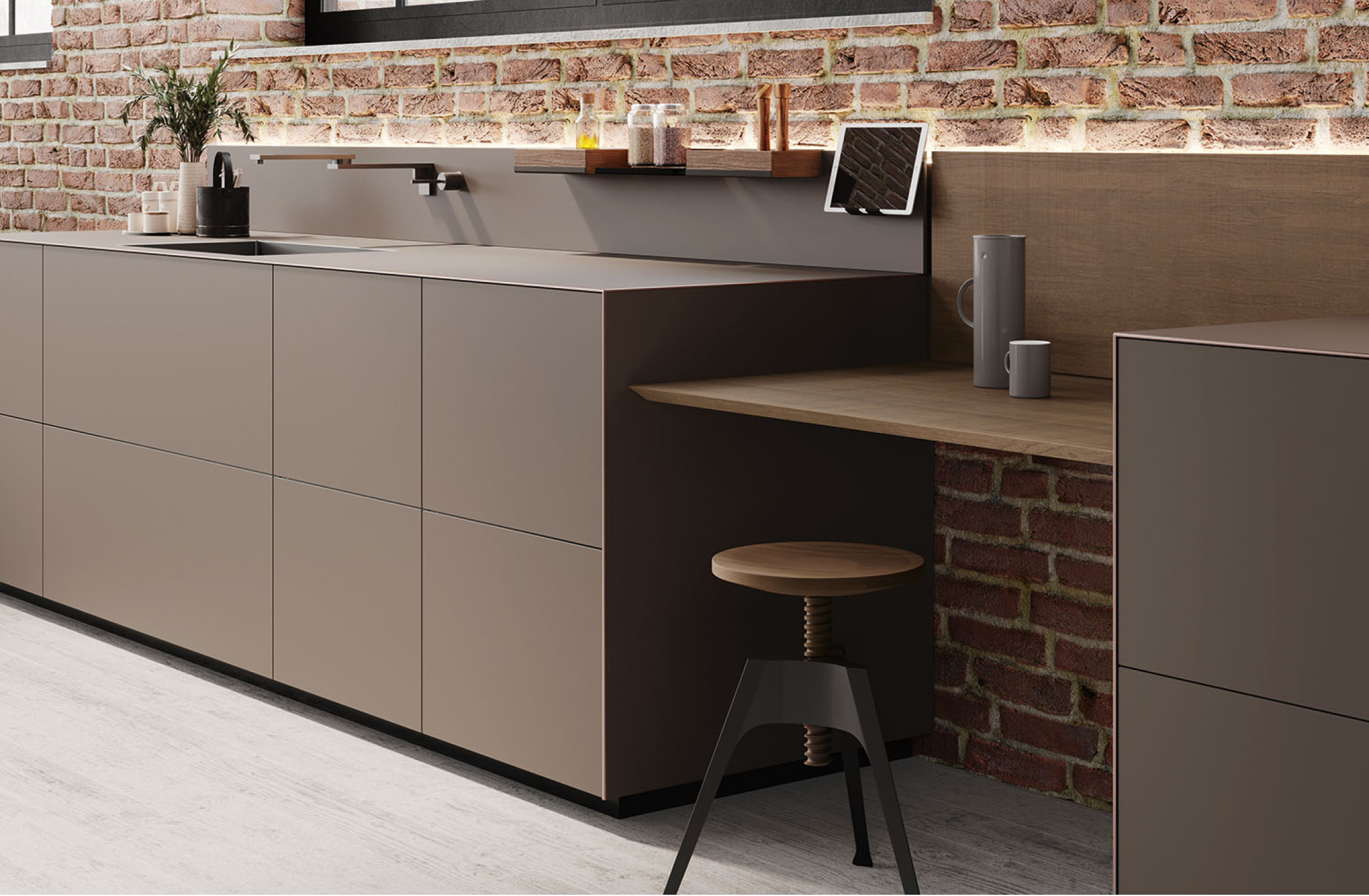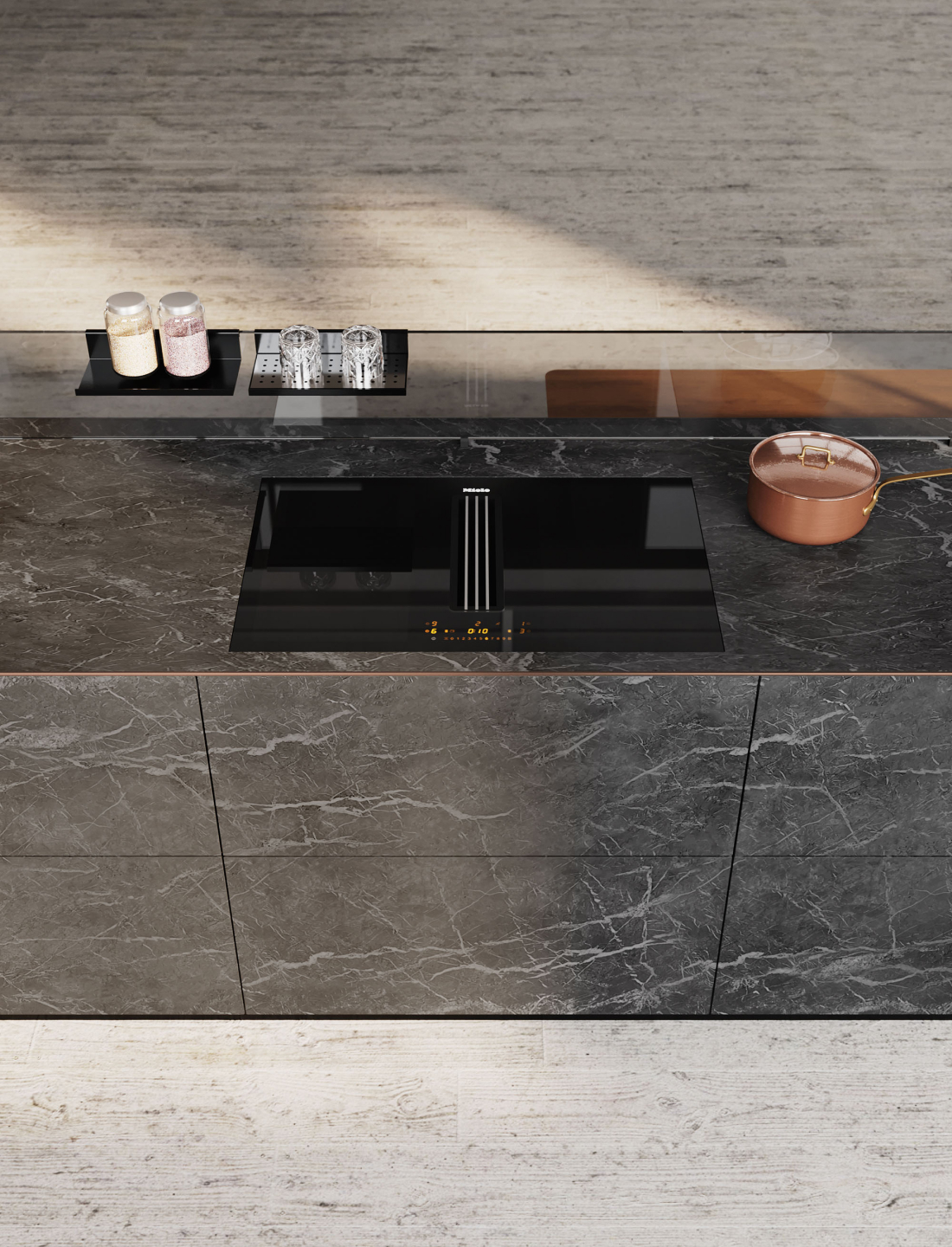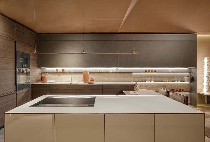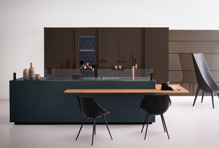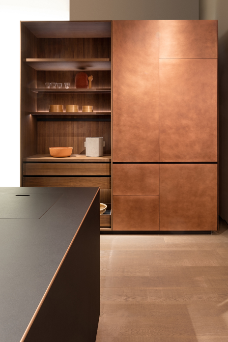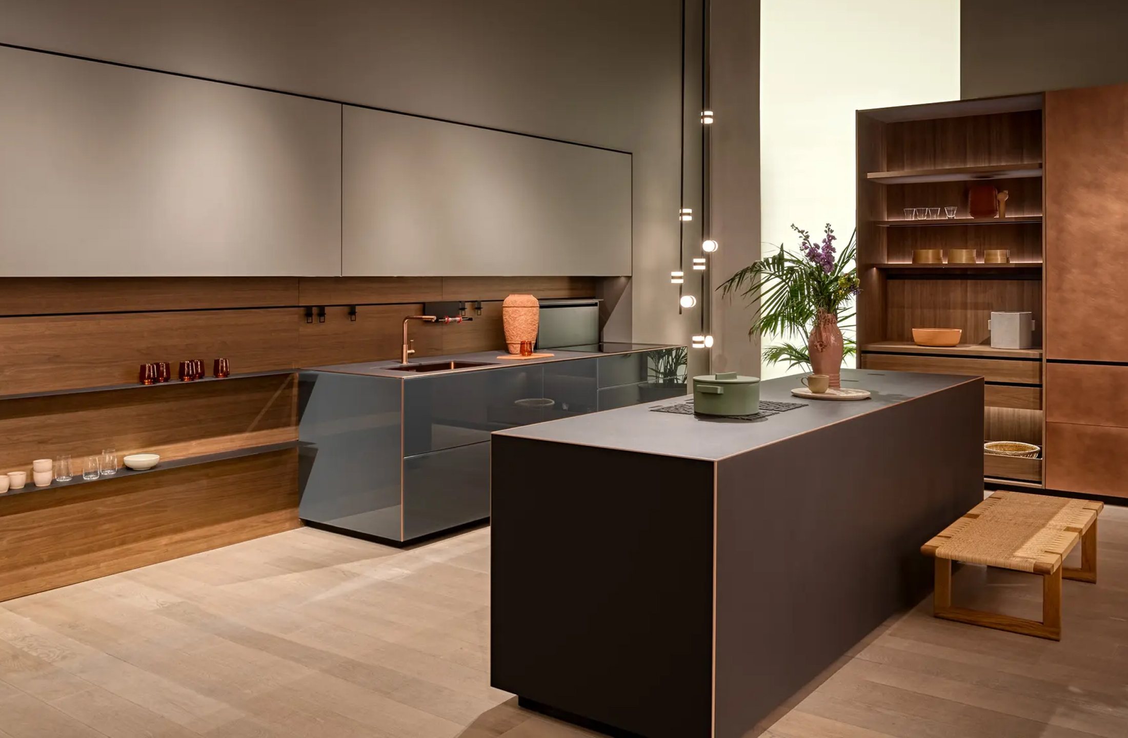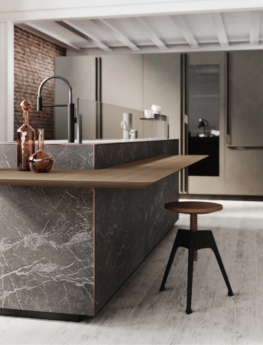 純粋なボリュームを追求し生まれたArtematica Soft Outlineは、トップ、扉、サイドパネルが一体となり、まるで一つの塊のような調和の取れたデザインを実現しています。上品に装飾された金属のプロファイルが、キッチンのエッジを走るように、ボリュームを際立たせています。さらに、シームレスな表面を強調し、洗練されたエレガンスを加えます。アルマイト加工を施したアルミプロファイルは、黒、銅、ブロンズからお選びいただけます。