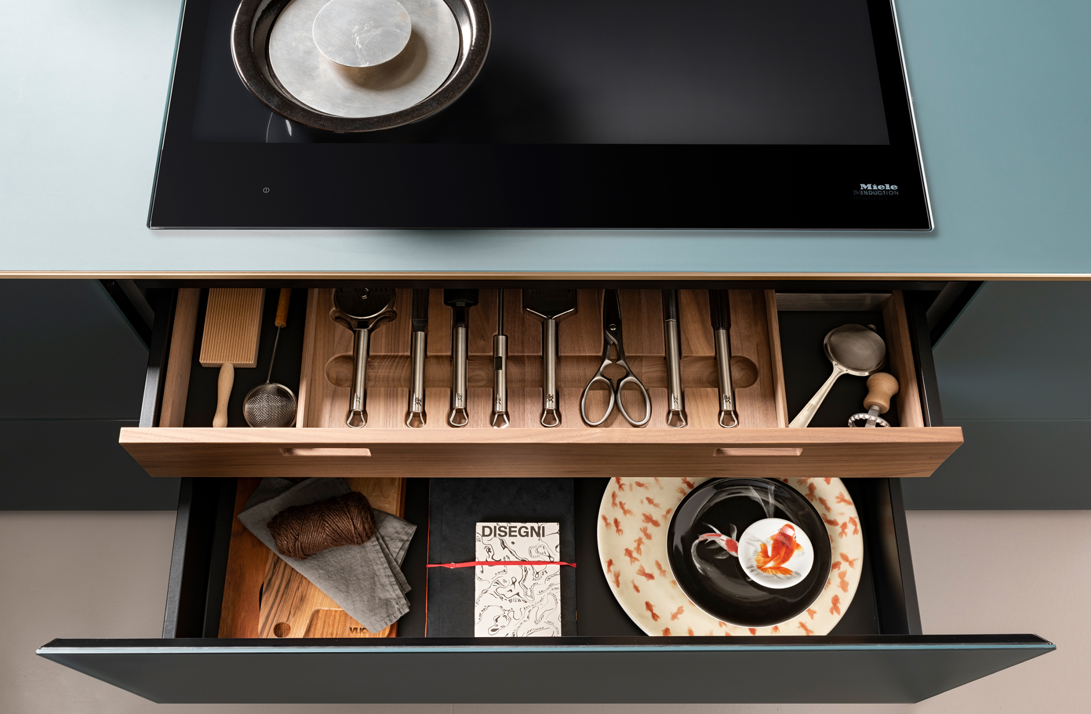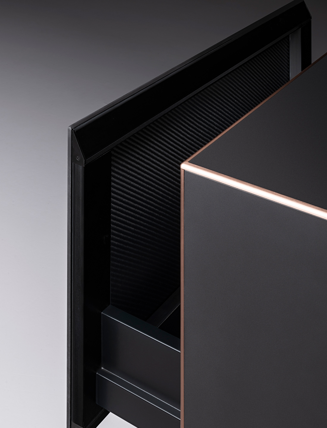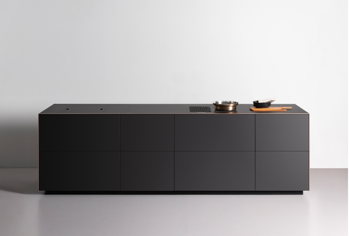Artematica Soft Outlineでは、Artematicaの「純粋なボリューム」のコンセプトが、レイアウトごとより独立したユニットとして表現されています。これらのユニットは、空間や個人の好みに応じて自由に組み合わせることが可能です。それぞれのユニットは、表面のエッジに沿って走る繊細な金属のプロファイルで引き立てられています。また、仕上げの選択肢が洗練されたエレガンスを演出します。木の温もり、金属の表現力、ガラスの色合い、それらが調和し洗練された空間を生み出します。