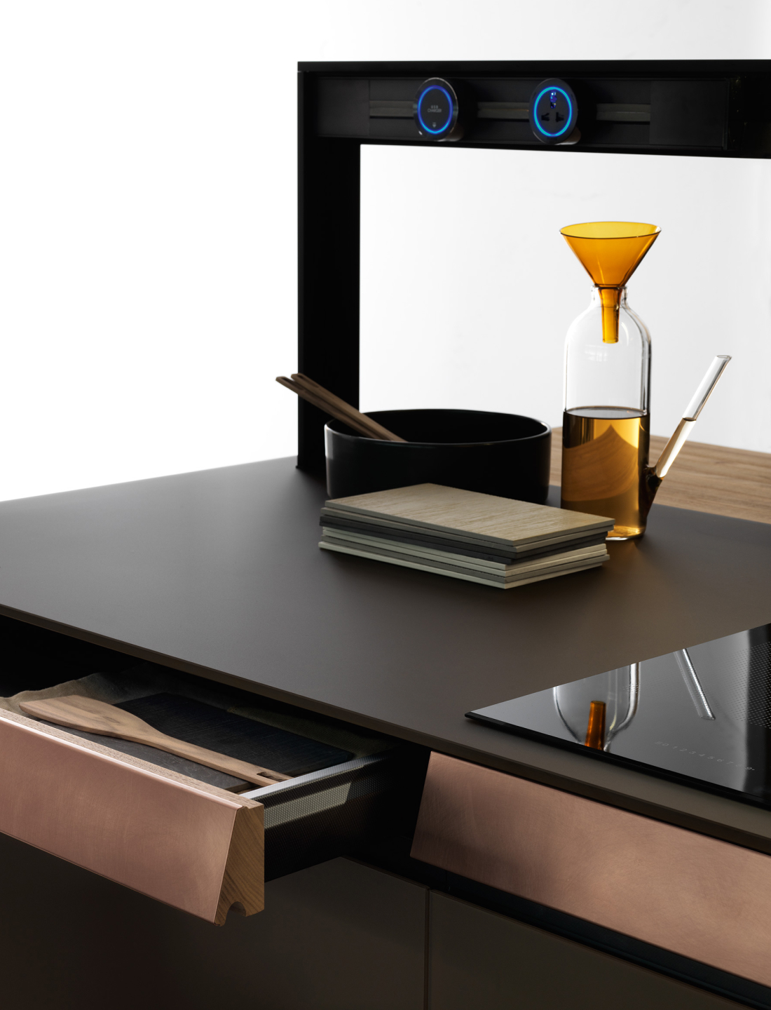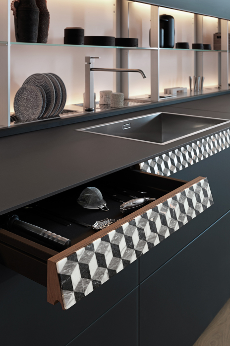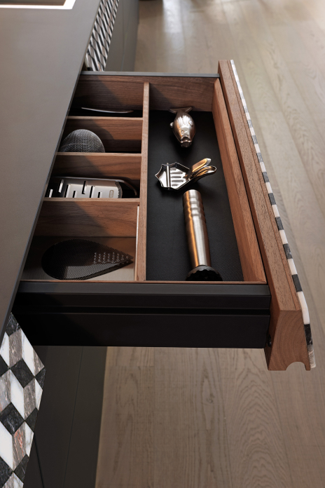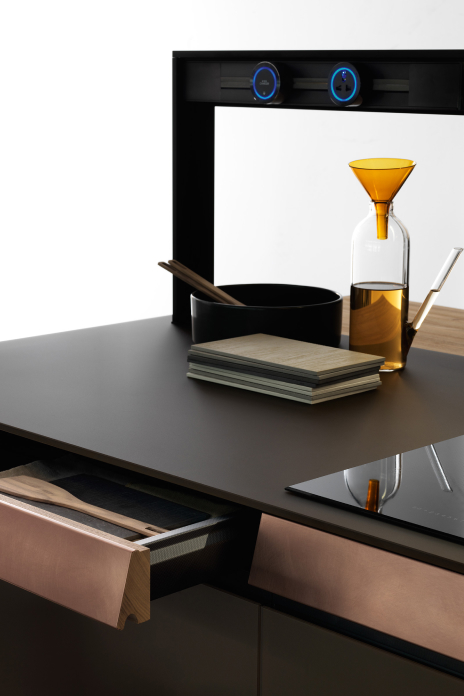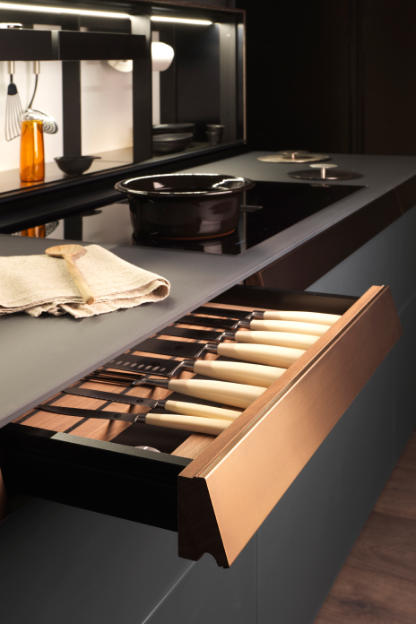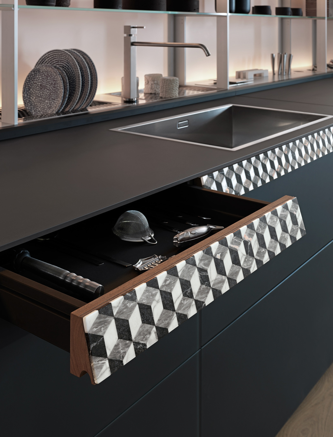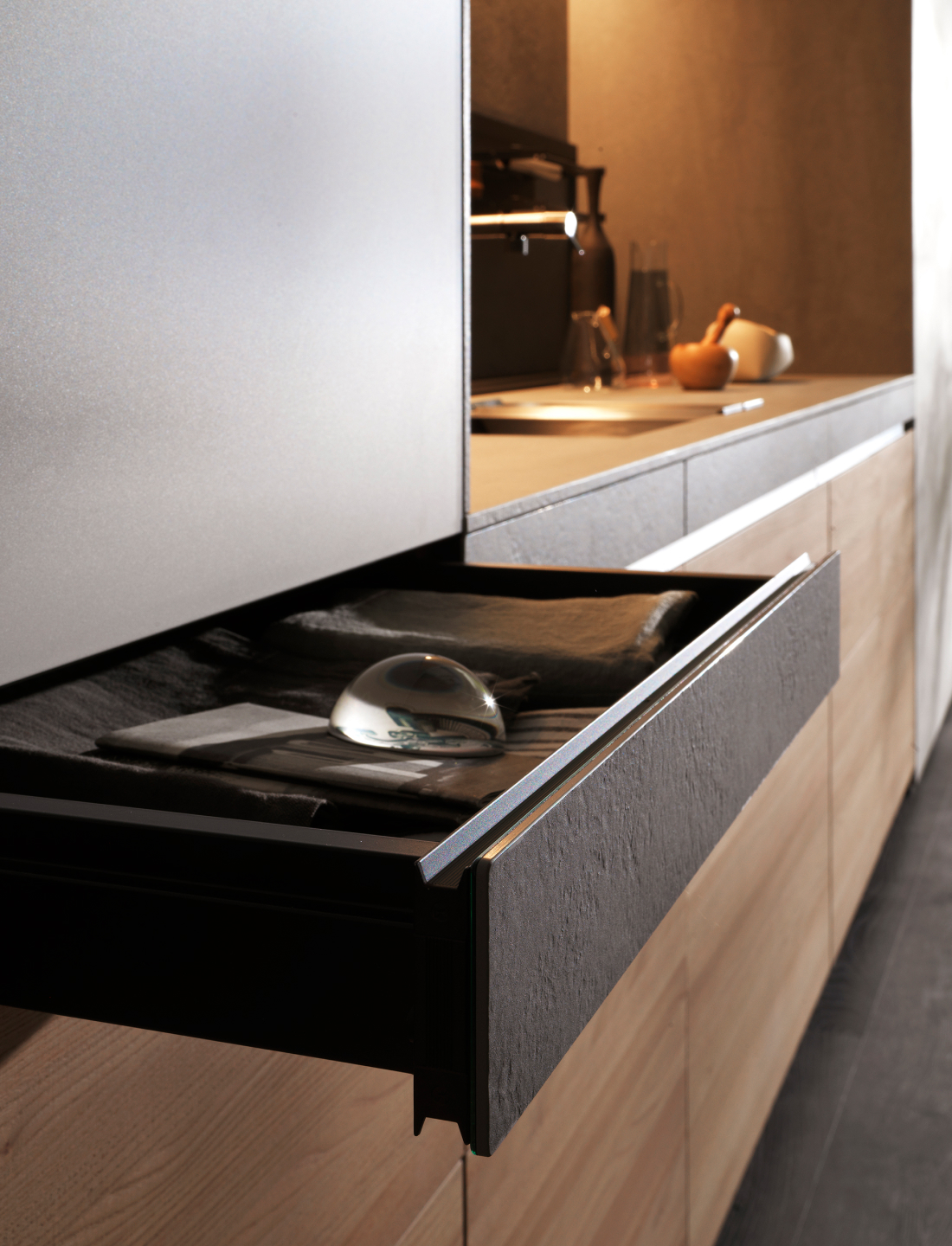ワークトップ下の小引き出しは、2つのバージョンで展開されています。一つは、ワークトップと一体となるようにキッチンのボリュームや素材に溶け込むデザインです。もう一つは、ワークトップと対比を生み、より強い印象を与える斜めのデザインです。さらに、Special Elementsによって収納や機能的な部分を隠し、常に整然とした印象と洗練された美しさを保ちます。