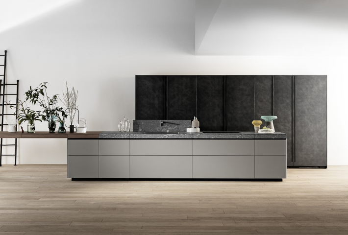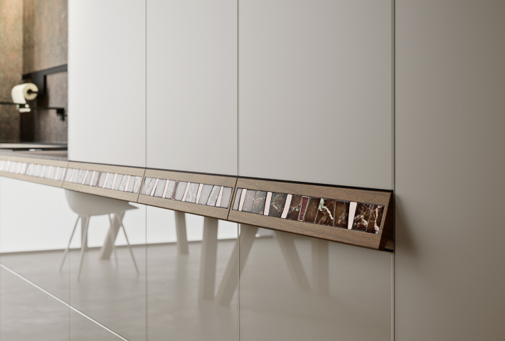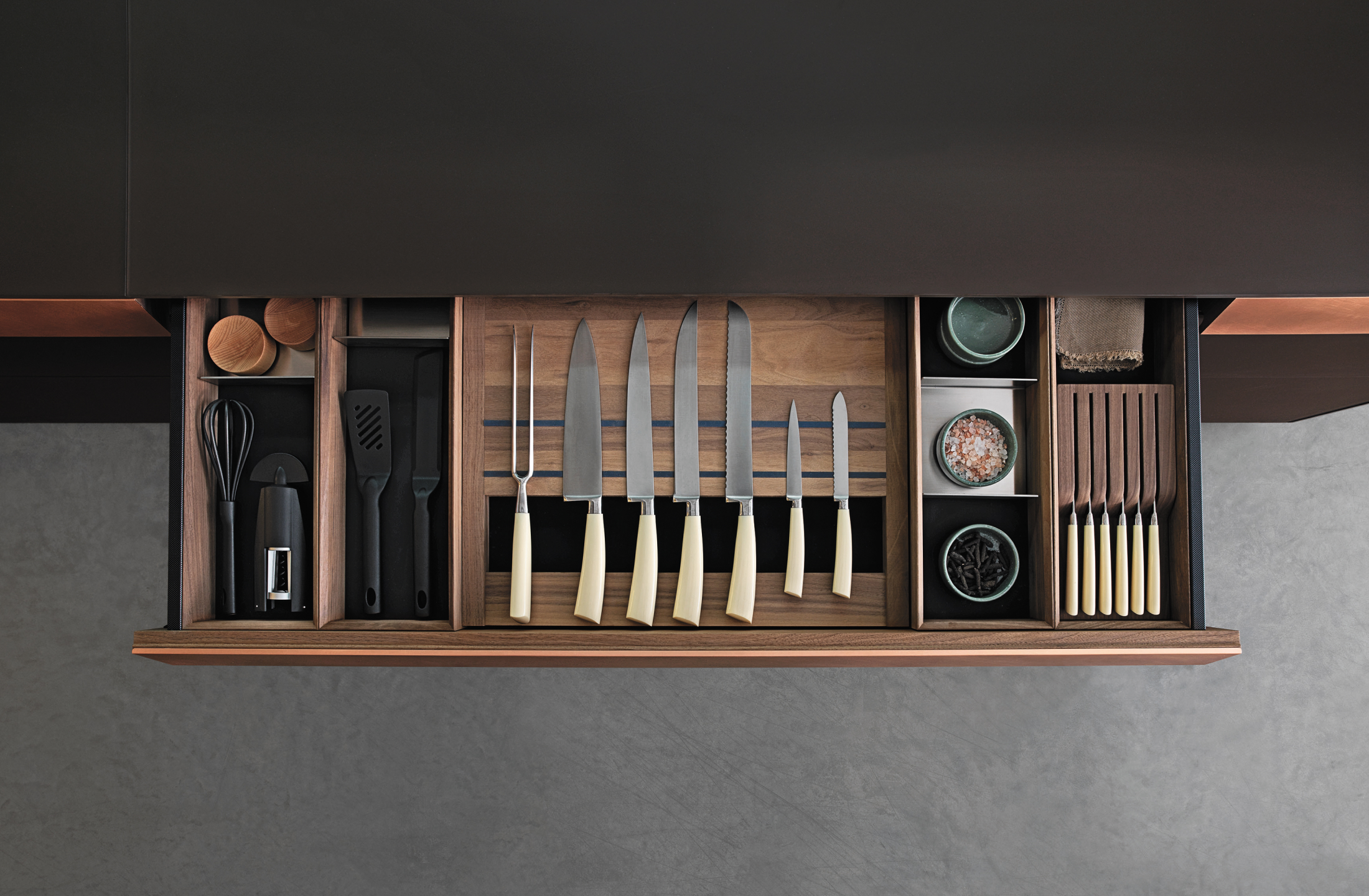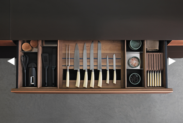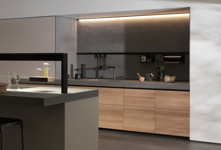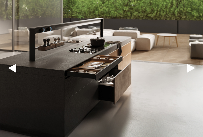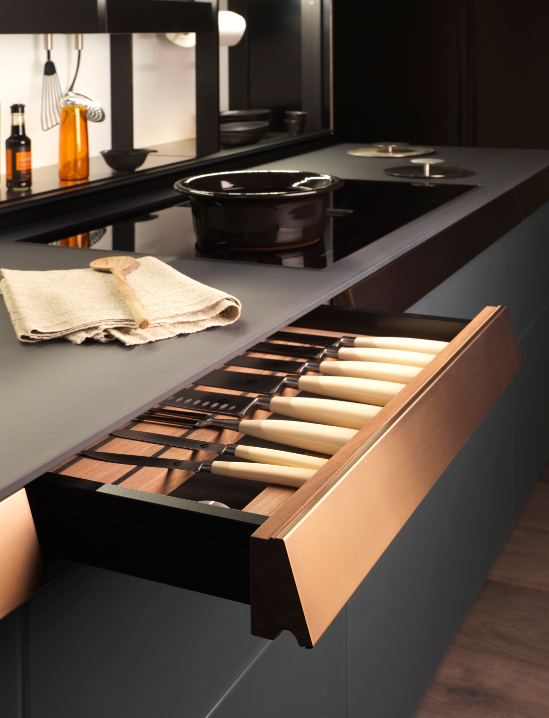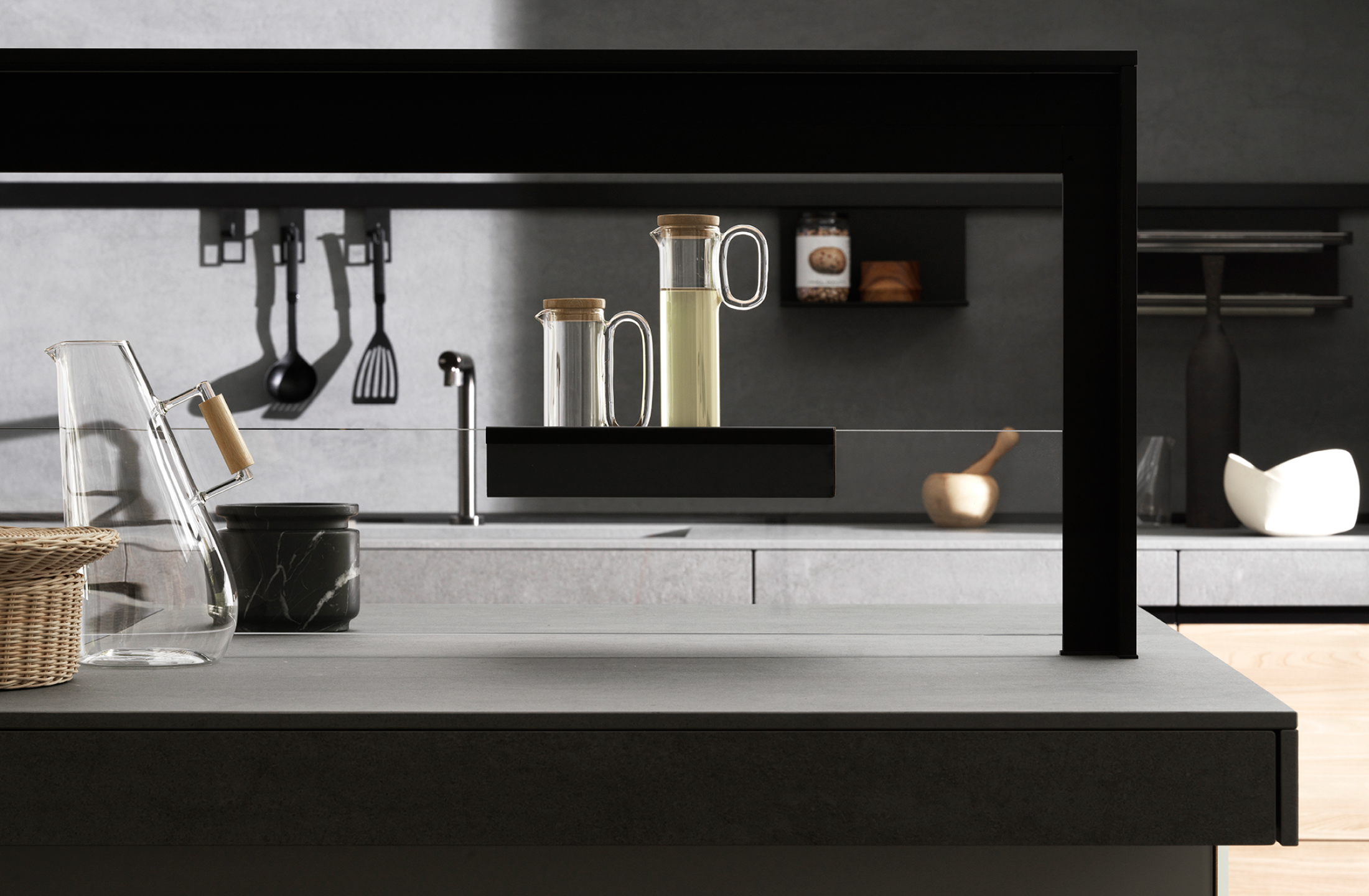ワークトップ下の小引き出しは、2つのバージョンで展開されています。一つは、ワークトップと一体となるようにキッチンのボリュームや素材に溶け込むデザインです。もう一つは、ワークトップと対比を生み、より強い印象を与える斜めのデザインです。さらに、Special Elementsによって収納や機能的な部分を隠し、常に整然とした印象と洗練された美しさを保ちます。