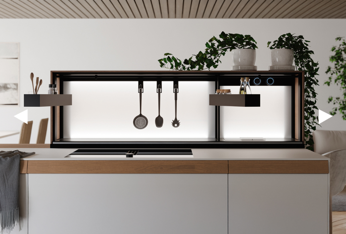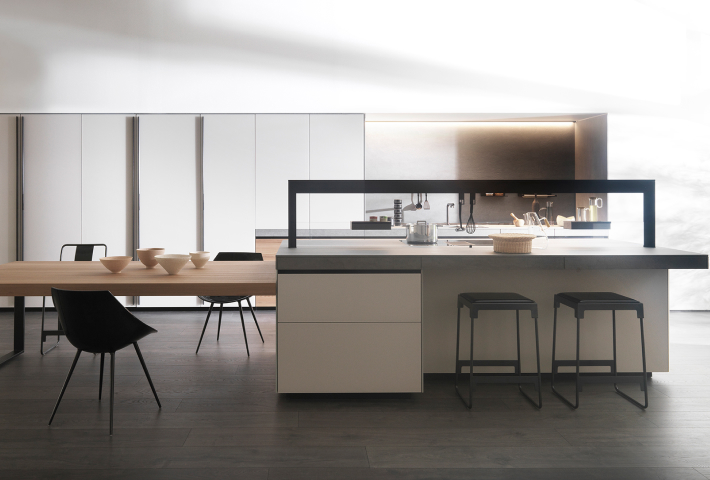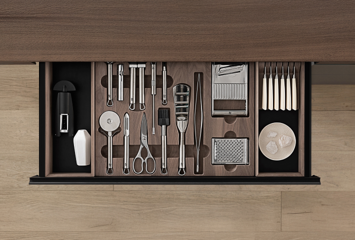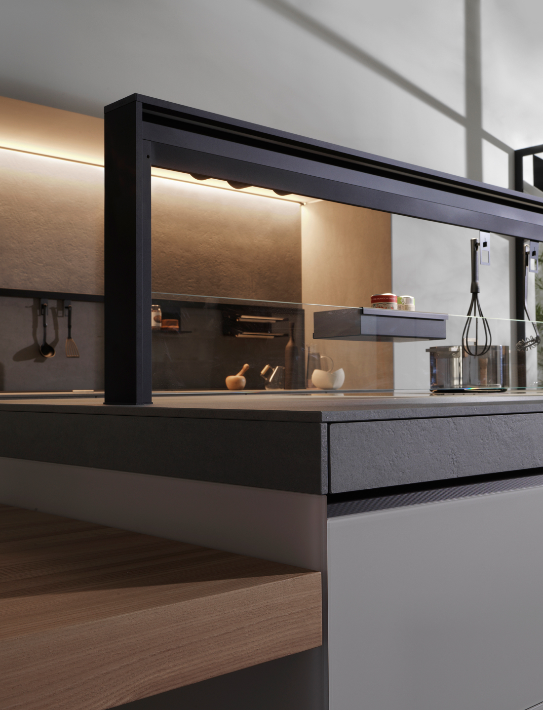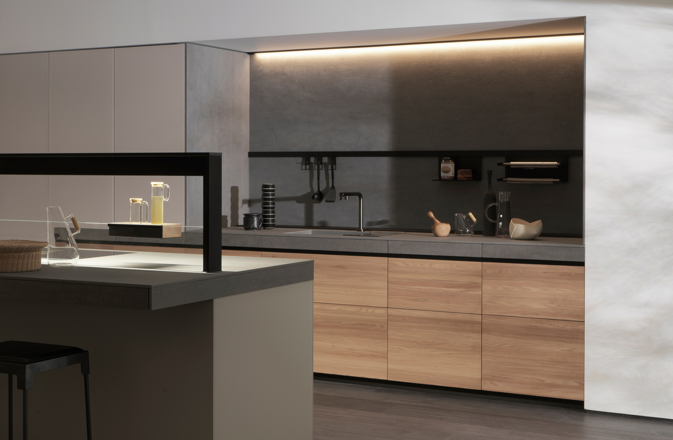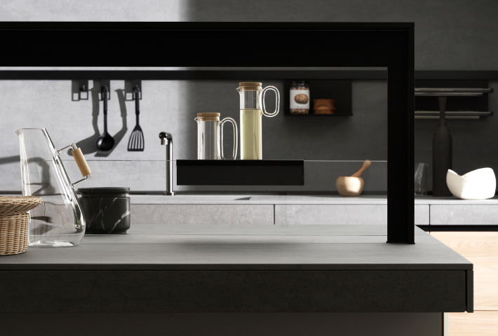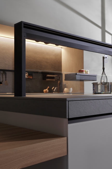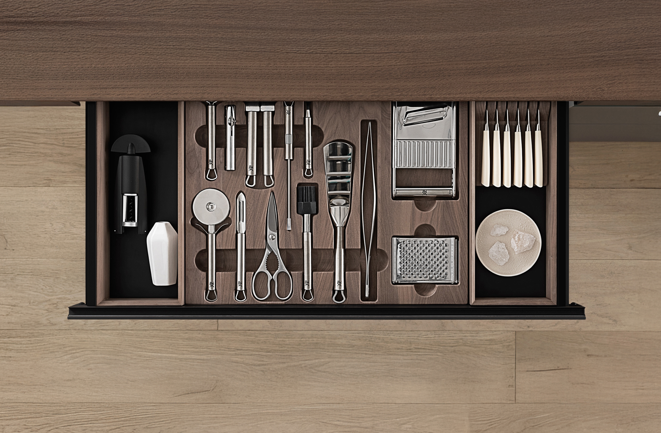 ワークトップ下の小引き出しは、2つのバージョンで展開されています。一つは、ワークトップと一体となるようにキッチンのボリュームや素材に溶け込むデザインです。もう一つは、ワークトップと対比を生み、より強い印象を与える斜めのデザインです。さらに、Special Elementsによって収納や機能的な部分を隠し、常に整然とした印象と洗練された美しさを保ちます。