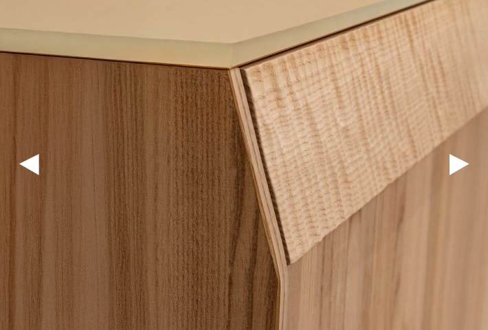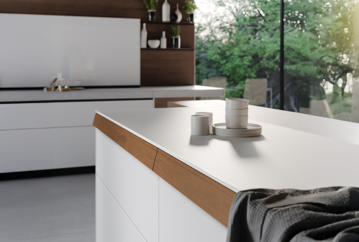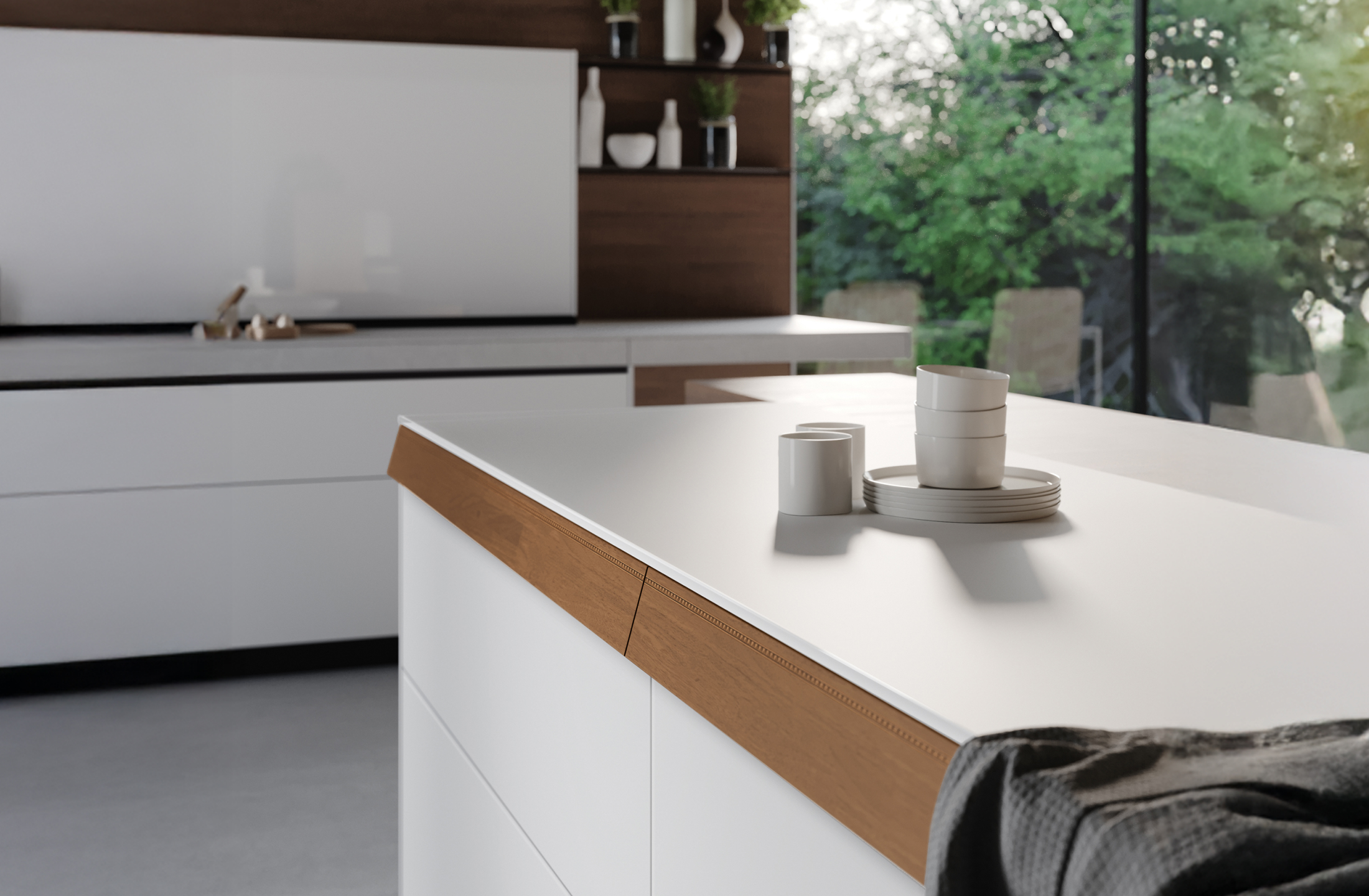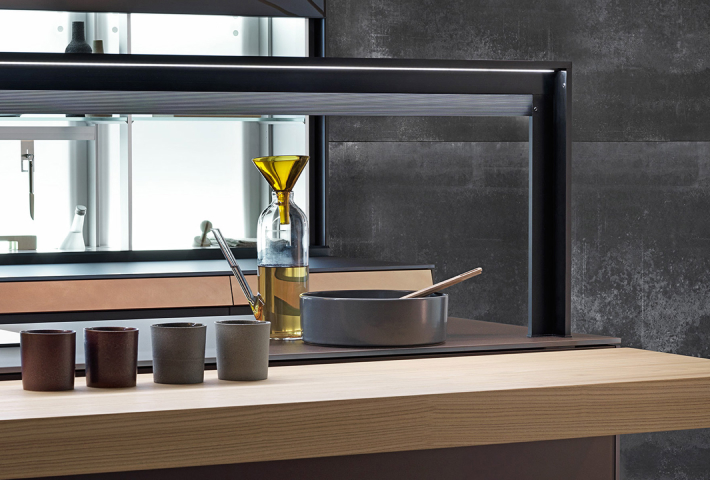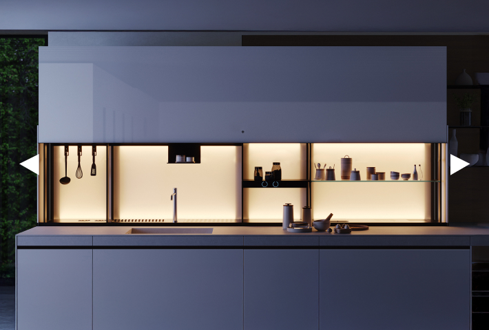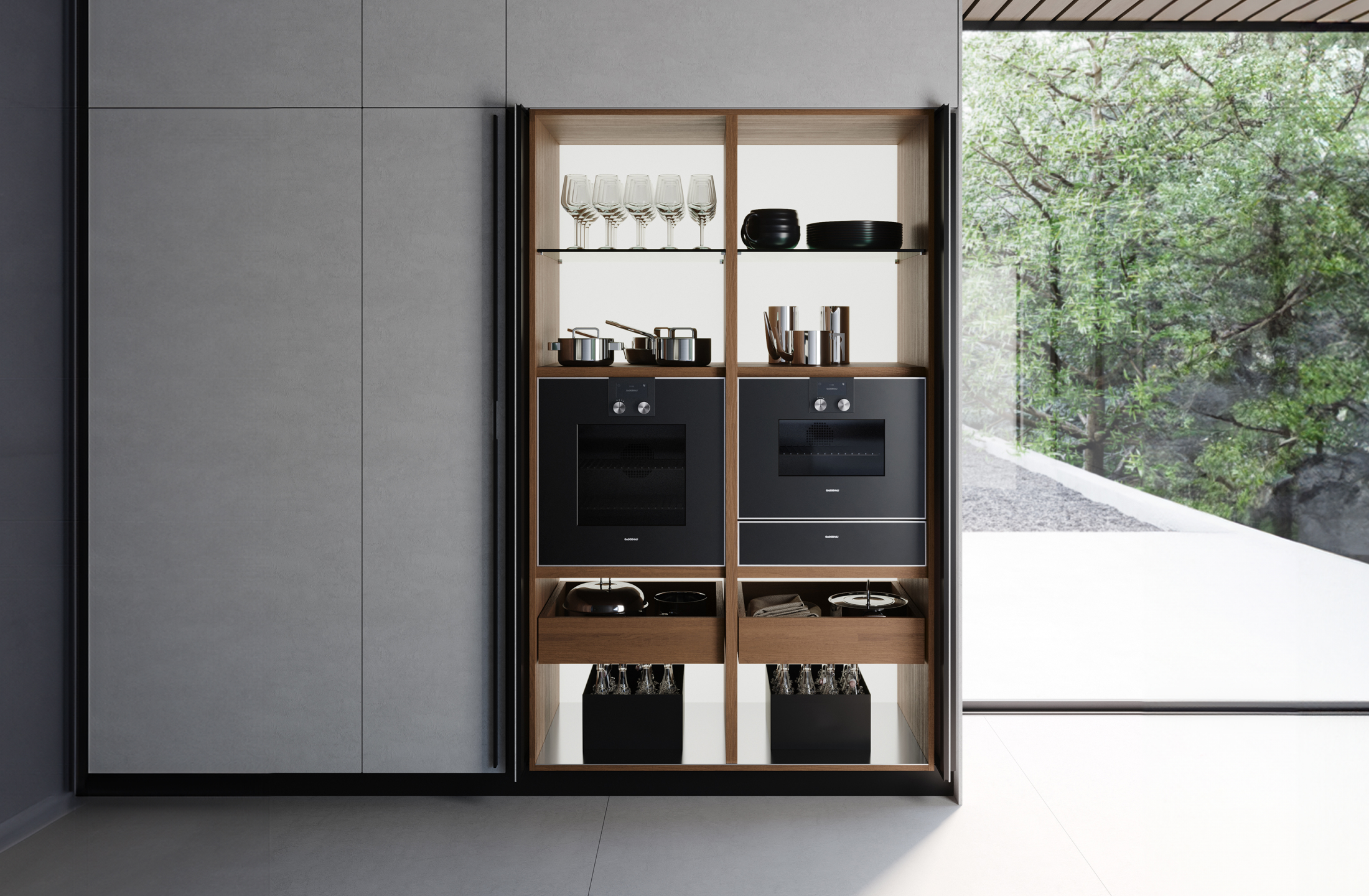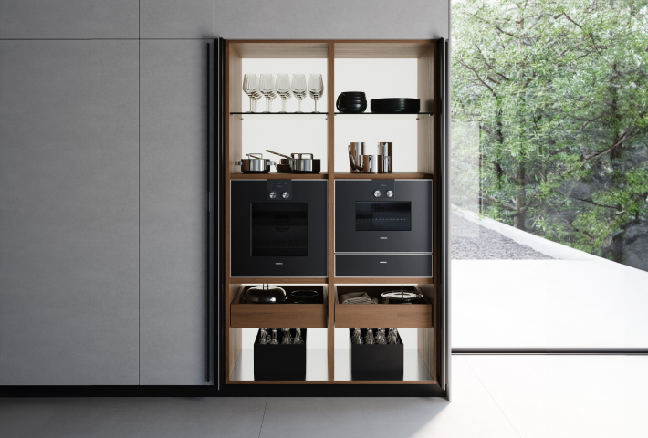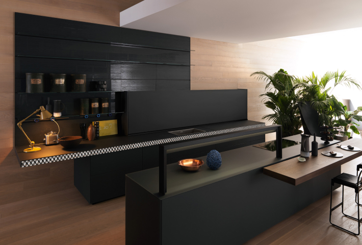 ワークトップ下の小引き出しは、2つのバージョンで展開されています。一つは、ワークトップと一体となるようにキッチンのボリュームや素材に溶け込むデザインです。もう一つは、ワークトップと対比を生み、より強い印象を与える斜めのデザインです。さらに、Special Elementsによって収納や機能的な部分を隠し、常に整然とした印象と洗練された美しさを保ちます。