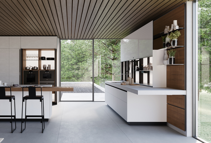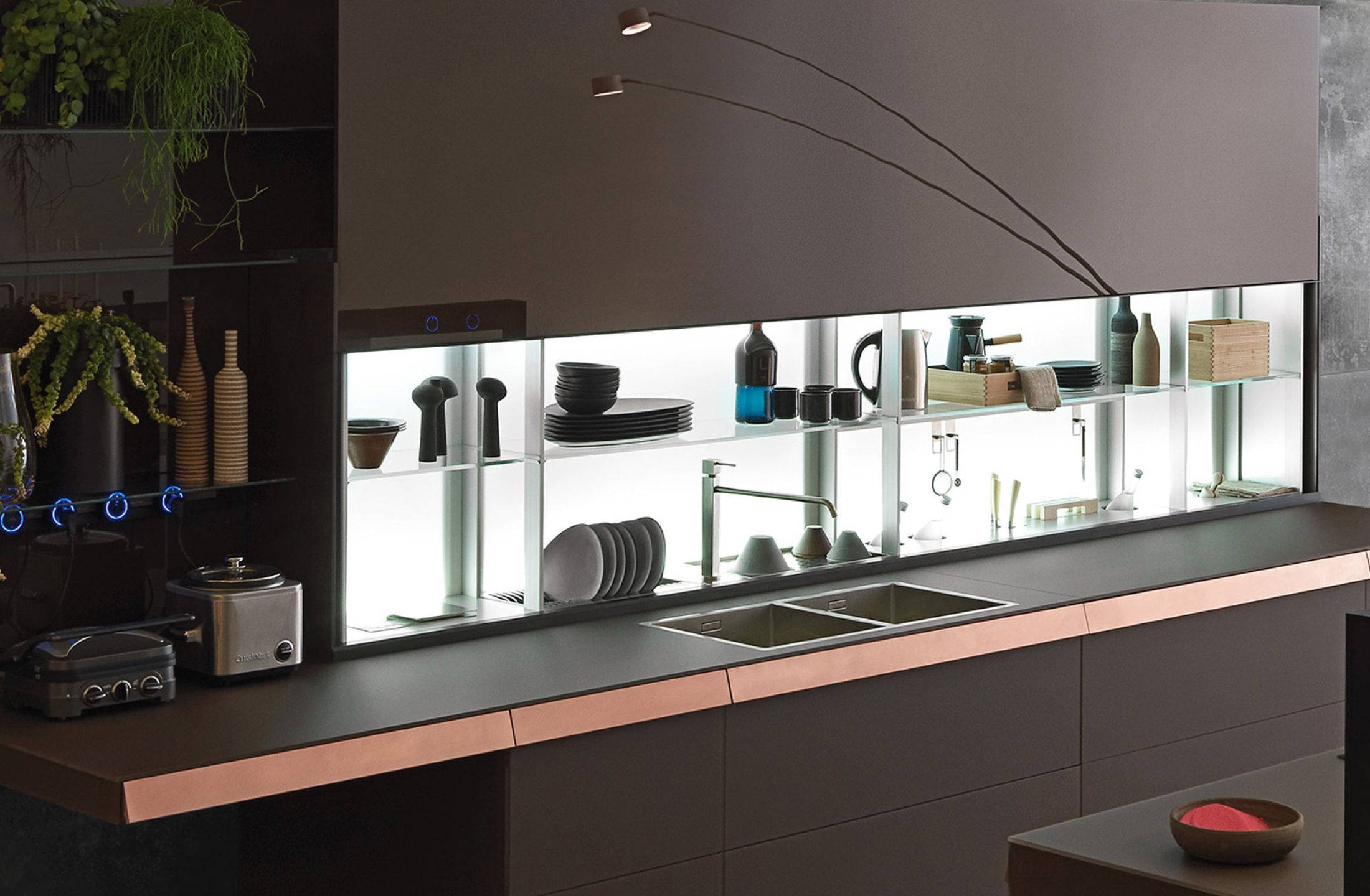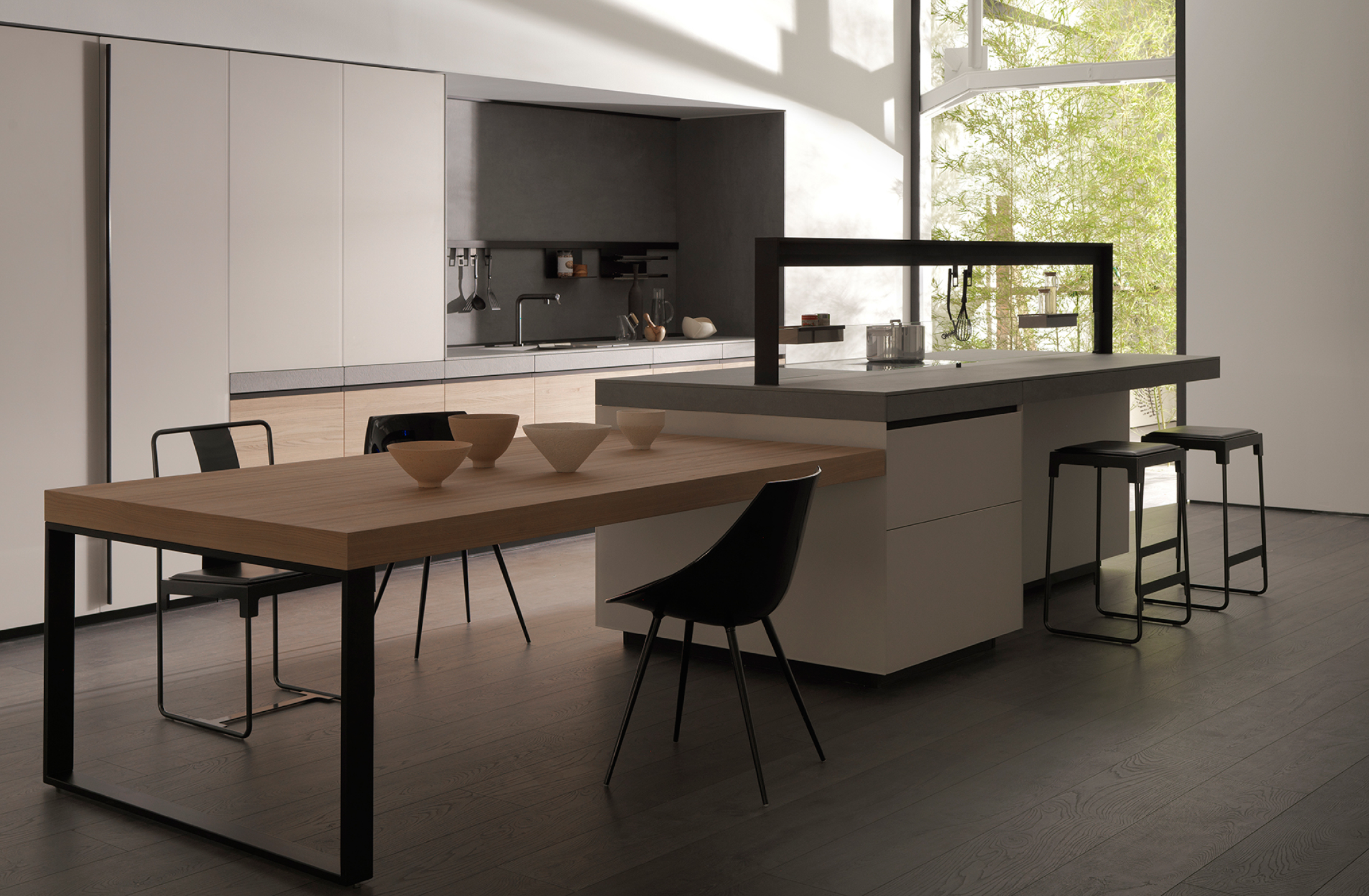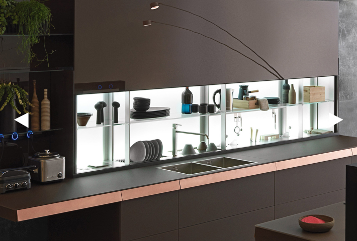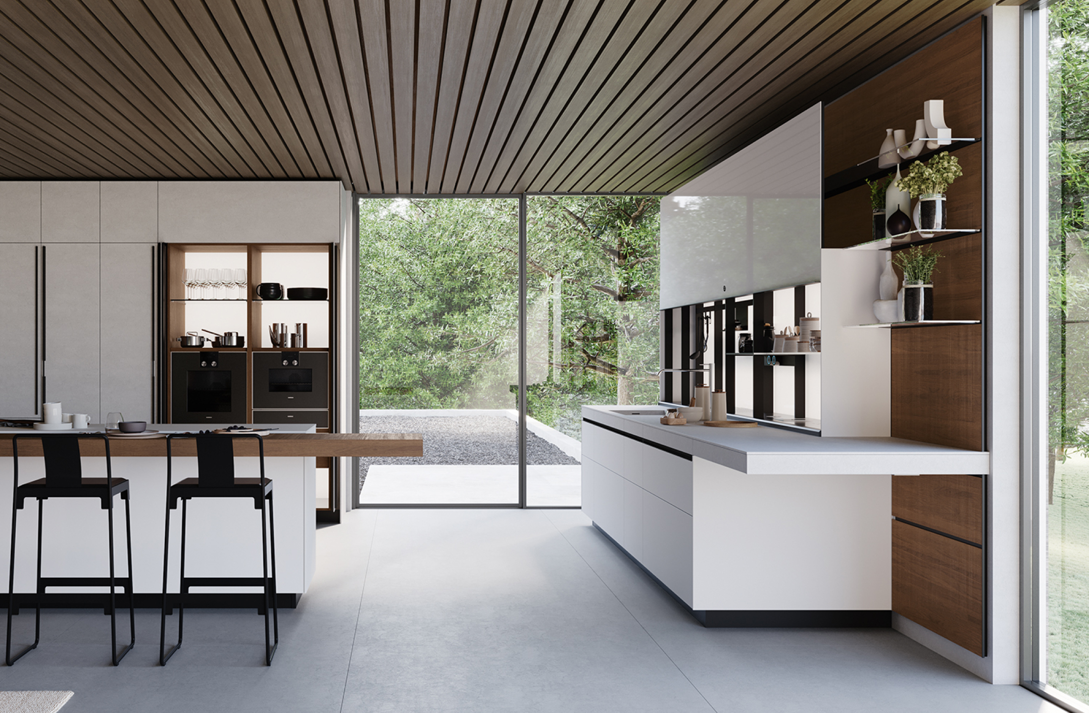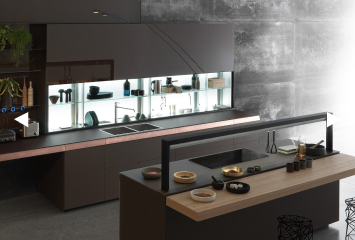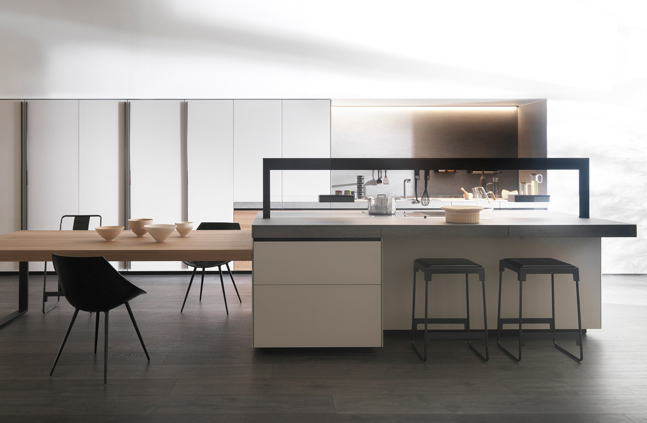 ワークトップ下の小引き出しは、2つのバージョンで展開されています。一つは、ワークトップと一体となるようにキッチンのボリュームや素材に溶け込むデザインです。もう一つは、ワークトップと対比を生み、より強い印象を与える斜めのデザインです。さらに、Special Elementsによって収納や機能的な部分を隠し、常に整然とした印象と洗練された美しさを保ちます。