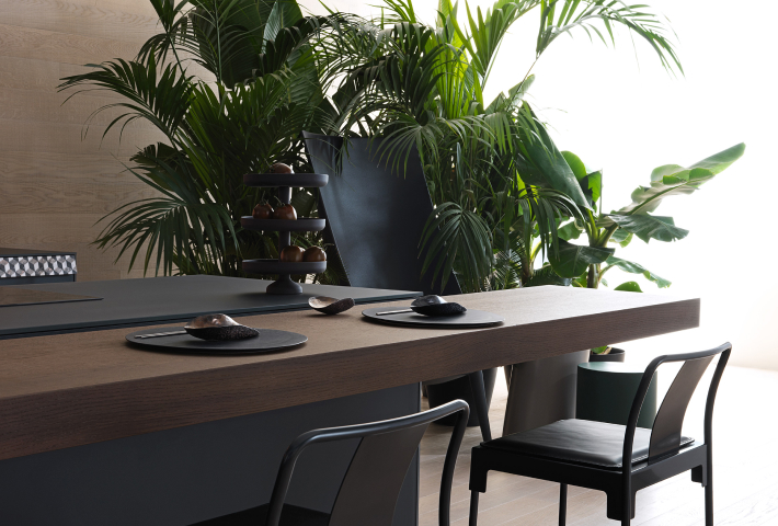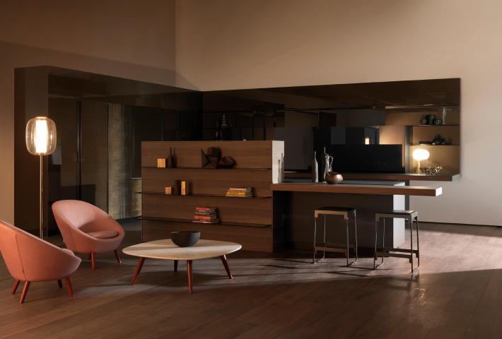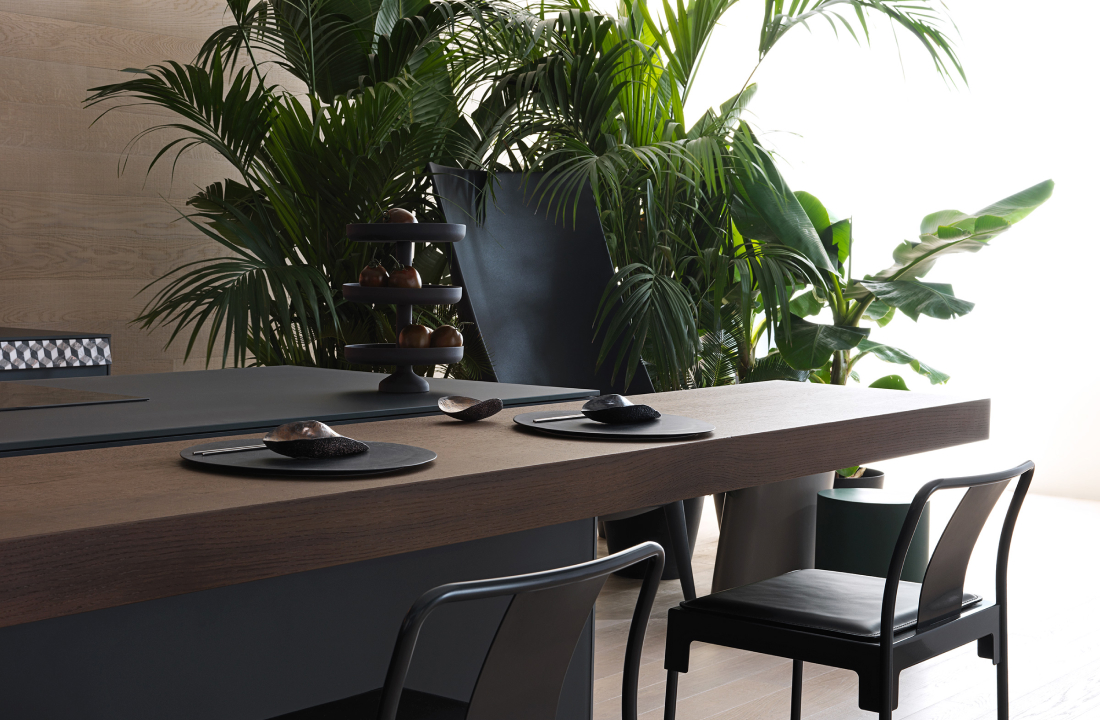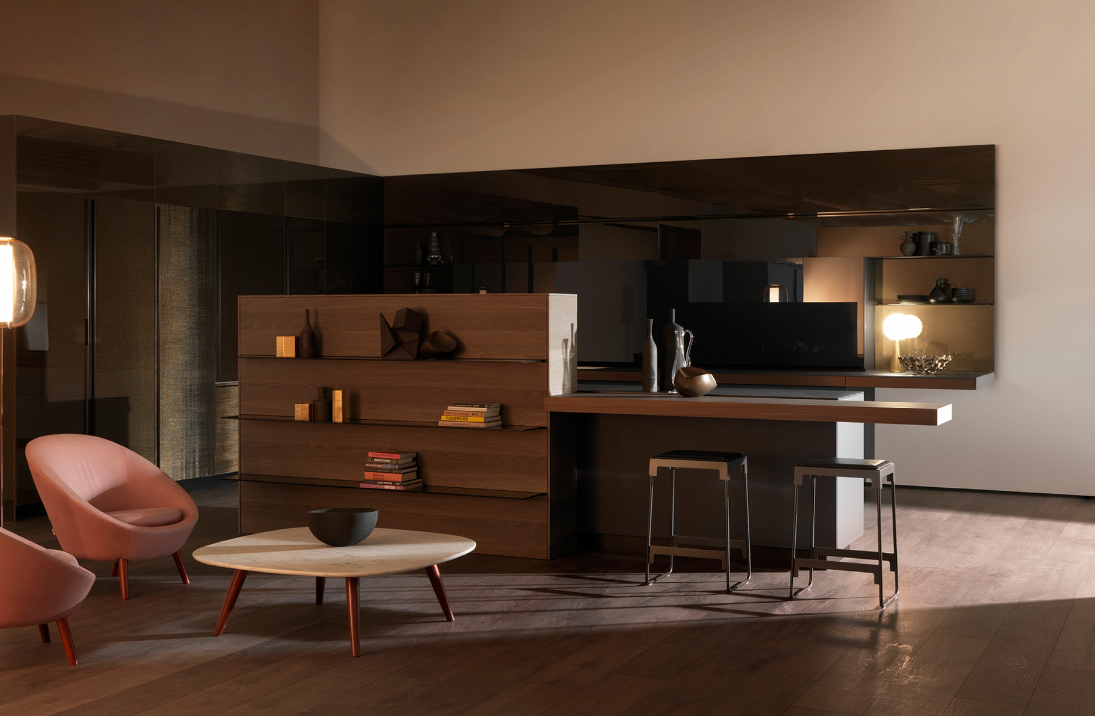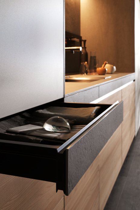 セクレタリーデスクのような、どこか秘密めく特別な空間がGenius Lociの引き出しには隠されています。この独創的なデザインは、ワークトップの厚みを最小限にする工夫によって生まれたもので、ワークトップ下の引き出しがキッチンの特徴的な要素となっています。さまざまな仕上げや職人技でカスタマイズ可能なこの繊細なディテールが、マテリアルが持つ純粋さと美しく調和します。